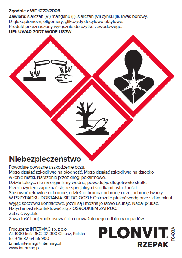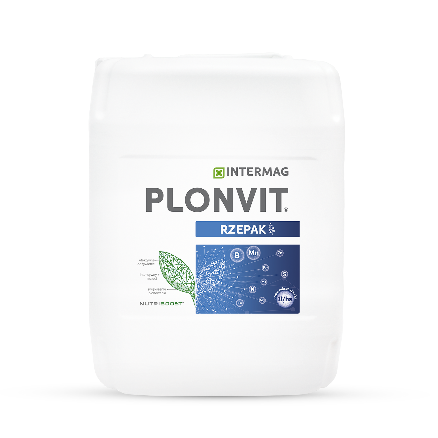 PLONVIT RZEPAK wyprodukowany według autorskiej receptury INTERMAG, przeznaczony do dokarmiania dolistnego roślin oleistych.